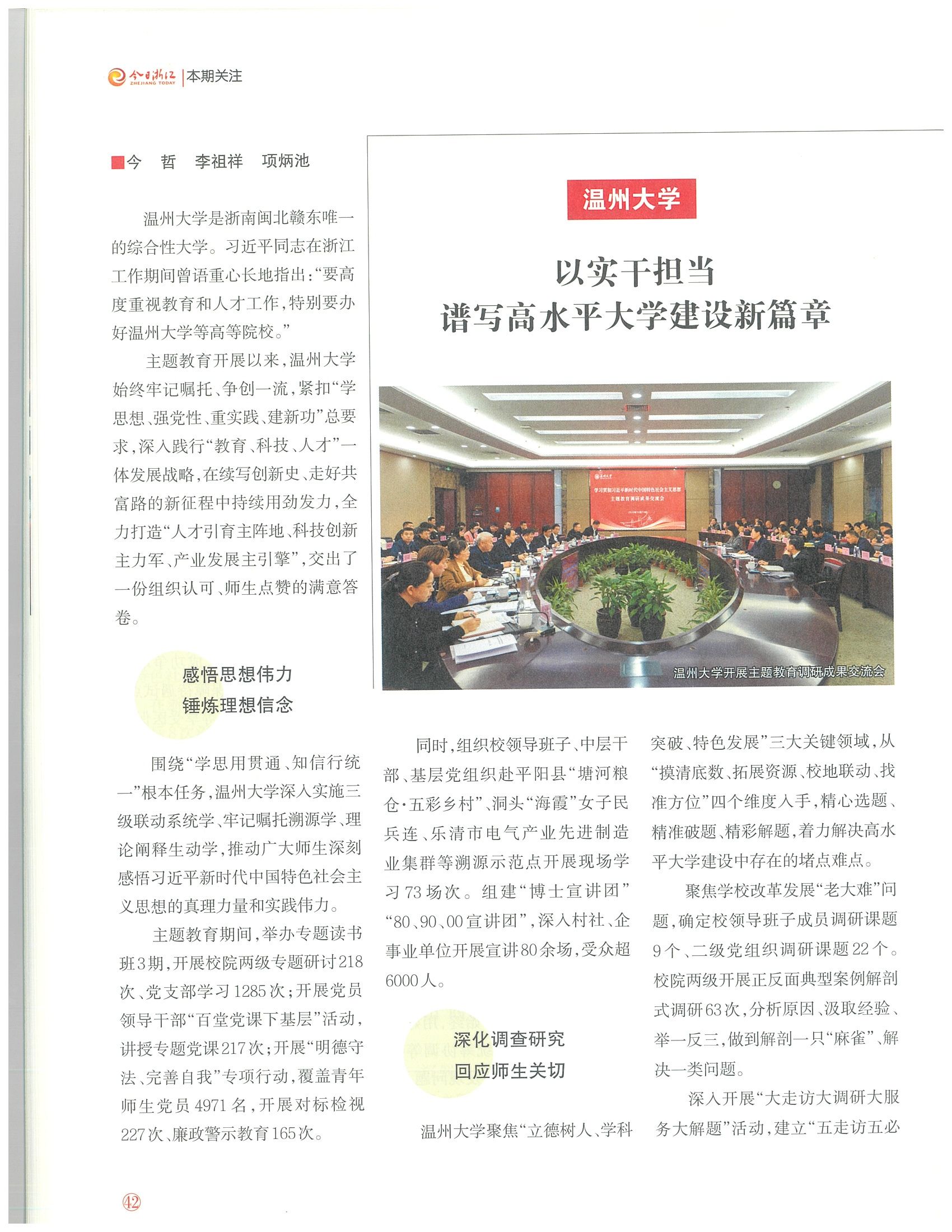 人才强校注入新动能。坚持党管人才,依托首批浙江省人才发展改革试点和国家级引才引智示范基地,与县市区探索共引共育机制,形成“人才入校、项目落地、学科发展、产业提升”格局。主题教育期间,引育鲲鹏人才、国家杰青、全国黄大年式教师团队等取得新突破,现拥有国家级人才37名、省级人才184名、博士1001名,为温州打造区域重要人才中心和创新高地提供坚实支撑。