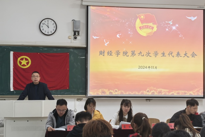 11月11日下午,财经学院第九次学生代表大会在龙湖校区致知楼A108教室顺利召开。财经学院党政领导和有关教师出席会议。来自学院各学生组织和班级的学生代表共64人参加会议。会议由财经学院学生会秘书长尹成超主持。