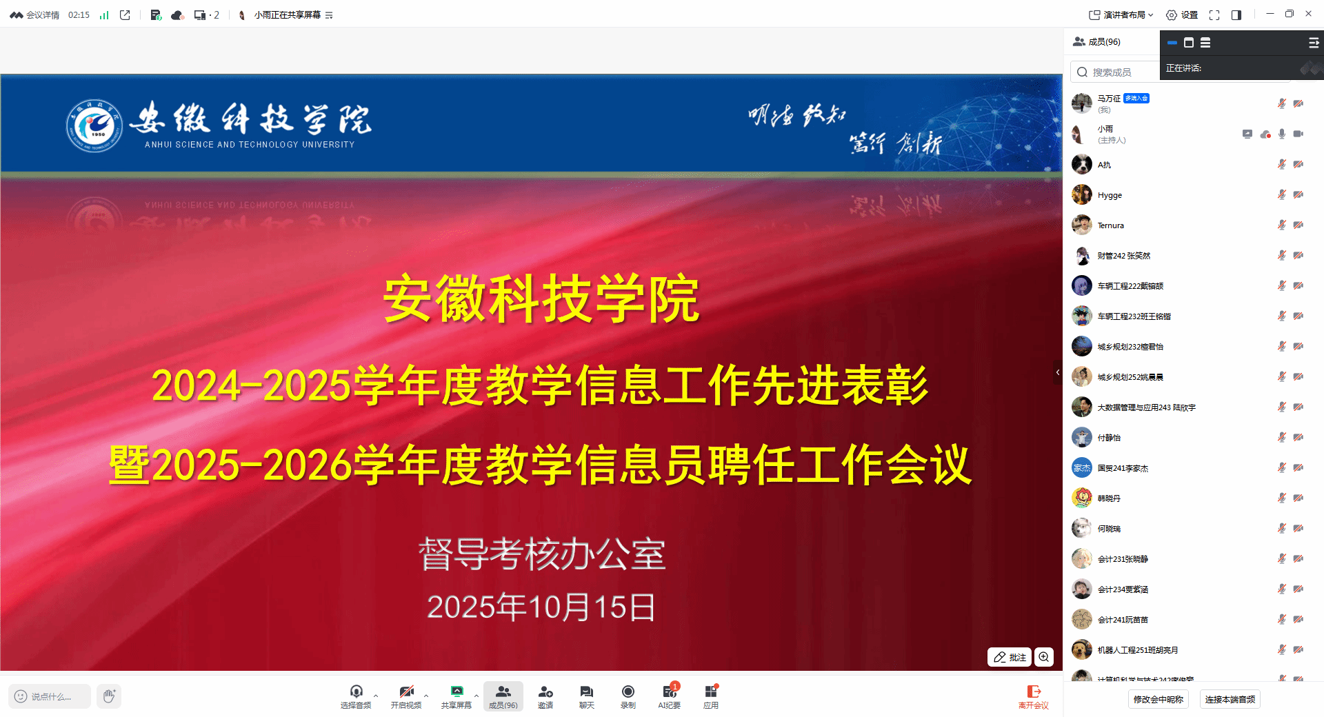 会上,督导考核办公室谢静静宣读了《关于表彰2024-2025学年度教学信息工作先进并聘任2025-2026学年度学生教学信息员的决定》,并带领全体参会人员共同学习了《开云在线登陆入口_开云(中国)学生教学信息员管理条例(修订)》。随后,她就教学信息员的工作内容开展了业务指导与培训。优秀教学信息员代表张瑞洁在会上作了经验分享。