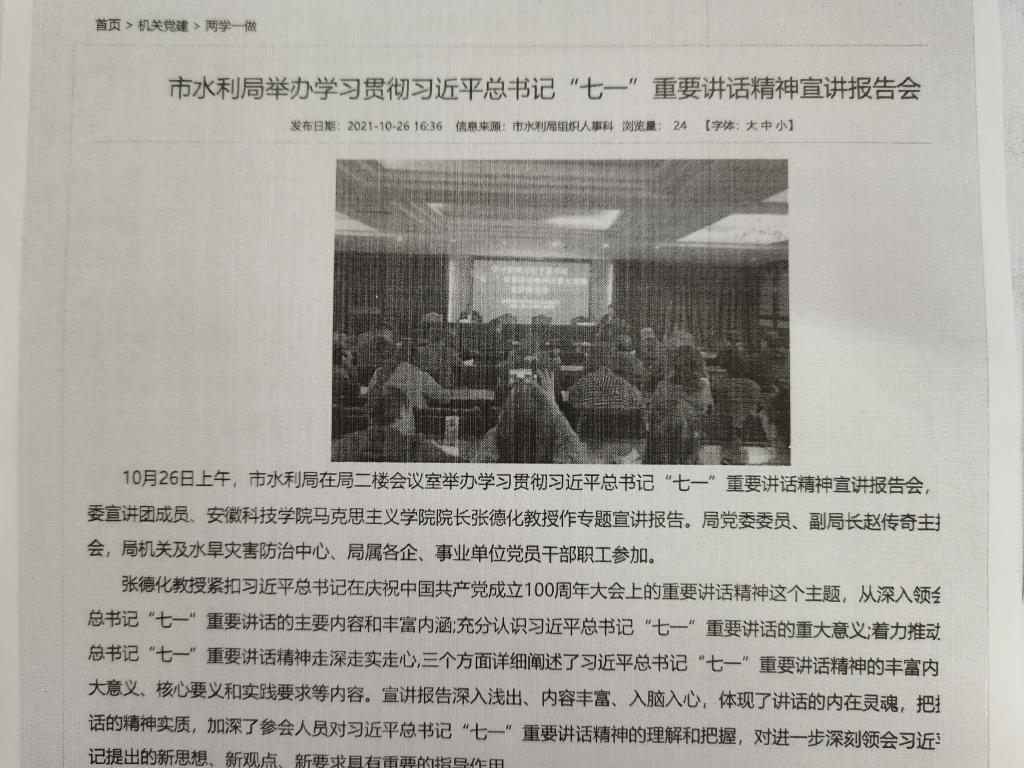 2021年10月26日张德化到蚌埠市水利局开展“七一”讲话宣讲