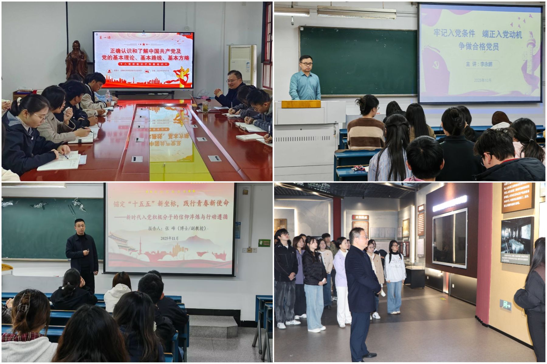 开班仪式上,动物科学学院党委书记甘宗平要求全体学员要深化理论学习,注重学用结合,在学习生活中发挥先锋模范作用,以实际行动争取早日加入党组织。理论教学环节,培训班按照教学大纲,通过5次授课开展了《中国共产党章程》、党史、习近平新时代中国特色社会主义思想、中国共产党的使命任务等专题理论学习,系统讲解党的基本理论、基本路线和基本方略。每次专题授课后均设置主题研讨环节,学员结合授课内容开展深入研讨。特色党课环节,学院张峰副教授主讲的特色党课《锚定“十五五”新坐标,践行青春新使命——新时代入党积极分子的信仰淬炼与行动逻辑》,结合专业特色,引导学员将个人理想与国家发展相结合。实践教学环节,组织学员们前往渡江战役总前委孙家圩子旧址开展革命传统教育,参观后学员围绕“新时代青年使命”进行研讨,在革命传统故事的感染下,学员们进一步坚定了永远跟党走的信念和奋斗新时代的决心。培训还设置了自主学习、志愿服务、撰写心得、结业考核环节,最终52名入党积极分子均顺利结业。