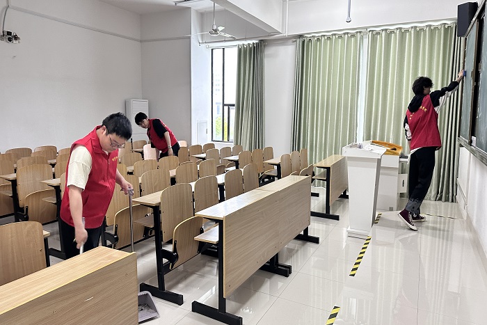 随后,学生会组织志愿者对教学楼进行清洁。志愿者们分工明确,认真清扫地面、擦拭黑板、整理桌椅等,有条不紊地将教学楼环境打扫干净,展现了学院学生不畏艰辛、乐于奉献、团结协作的志愿服务精神。