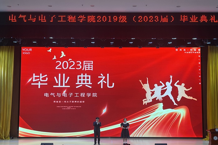 6月8日晚,电气与电子工程学院2023届毕业典礼于东辅楼报告厅隆重举行。学院党委书记骆海邦,党委副书记、院长夏显明,党委副书记、纪委书记尚磊,副院长国海,副院长樊晓宇,校团委副书记王乐,党政办公室主任王延丽,团委书记张成孜出席典礼,学院各系室负责人,专职辅导员及2023届毕业生参加典礼。典礼由骆海邦主持。