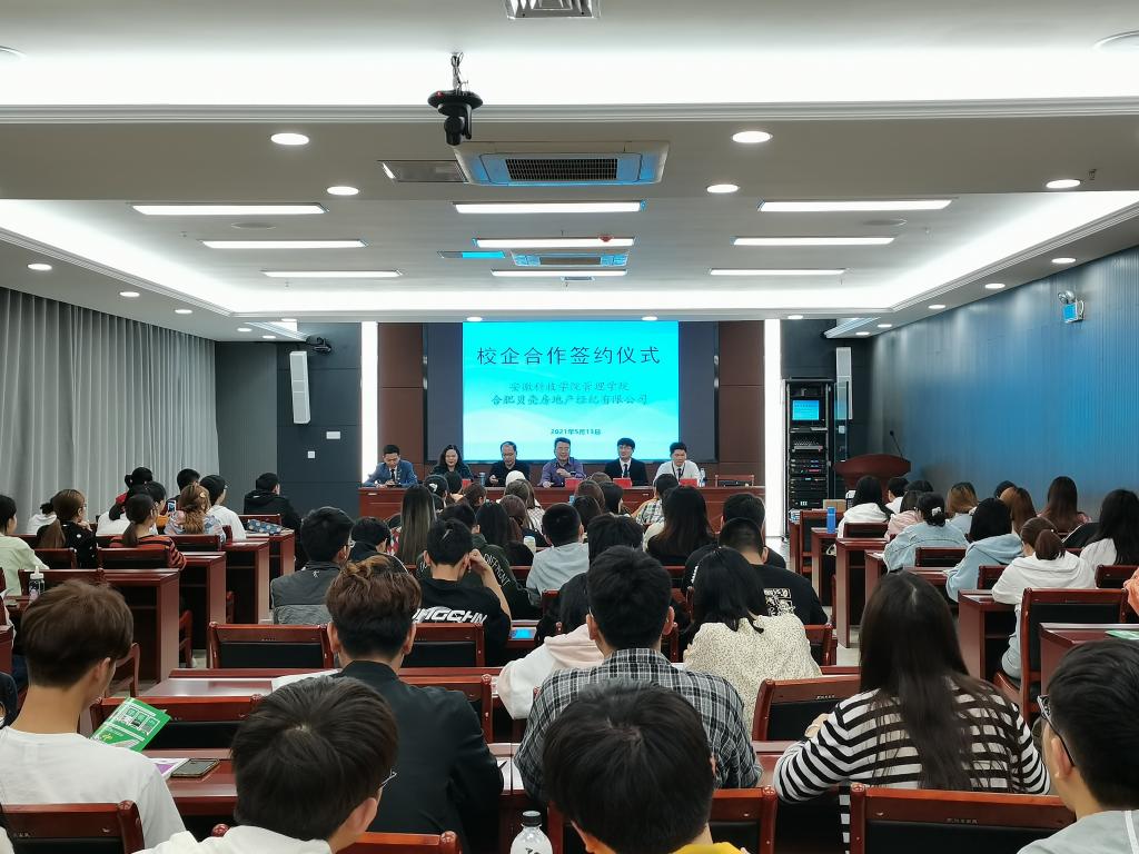 赵伟峰与王浩共同签署了《开云在线登陆入口_开云(中国)与合肥贝壳房地产经纪有限公司校企合作协议书》,举行了人才培养合作班授牌仪式。