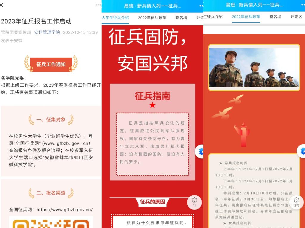 12月8日至20日,为鼓励广大学子响应国家号召,积极投身到保卫祖国的神圣事业中,管理学院利用易班微社区平台、微信公众号、班级QQ群等多种新媒体宣传发布征兵相关政策和工作动态,营造参军入伍的浓厚氛围。此外,各班级辅导员召开线上主题班会播放征兵公益宣传片《火热军营 精彩人生》,加强学生们对国防知识和征兵入伍政策的了解,鼓励同学们去军营中锻炼自己,磨练意志。