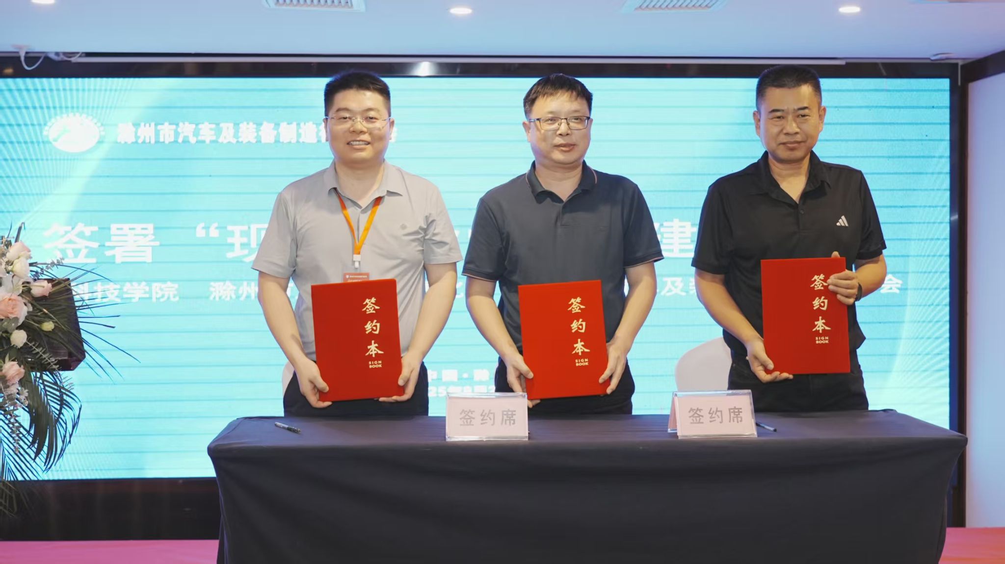 舒英杰、滁州市工信局装备科科长张巍、滁州市汽车及装备制造行业协会秘书长吕志成共同签署“现代产业学院共建协议”。