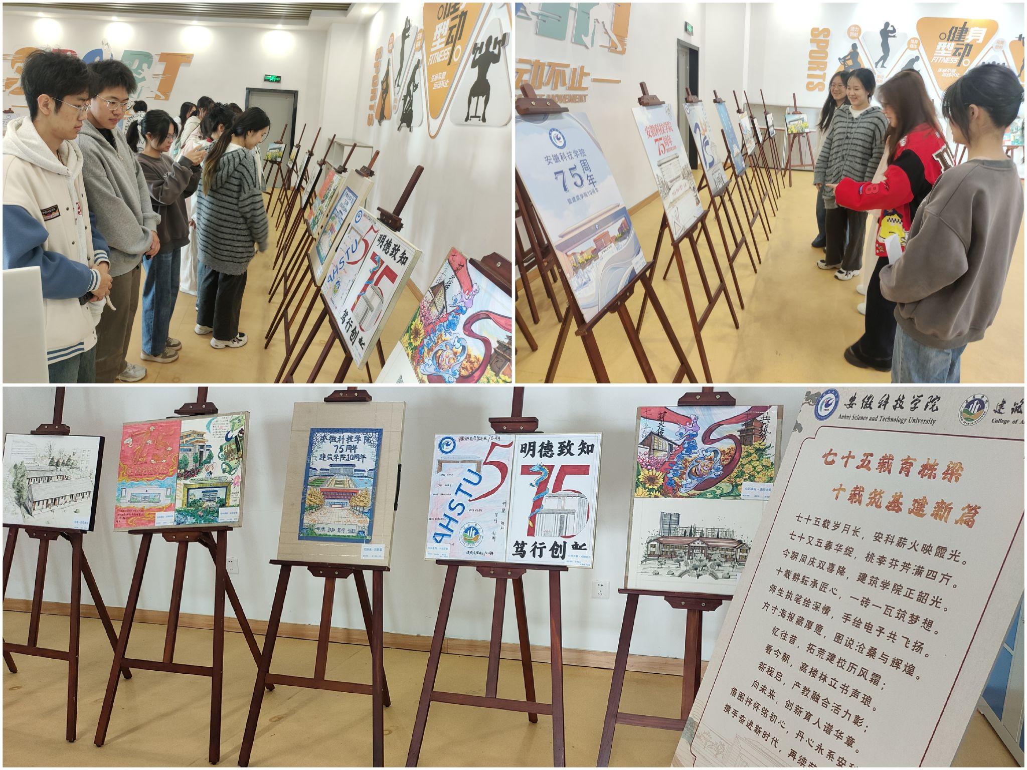 参展作品以图文结合的方式呈现,聚焦开云在线登陆入口_开云(中国)75年来的办学历程和建筑学院10年的发展足迹。有的作品回顾了学校发展中的重要节点,有的记录了学院成长中的难忘瞬间。同学们用简洁的文字和清晰的视觉设计,表达对校园生活的观察与思考。这些作品既体现了基本的设计能力,也流露出对学校和学院发展的关注。观展师生在驻足观看的过程中,不仅了解了校院的发展脉络,也在细节中感受到一种真实而朴素的情感共鸣。