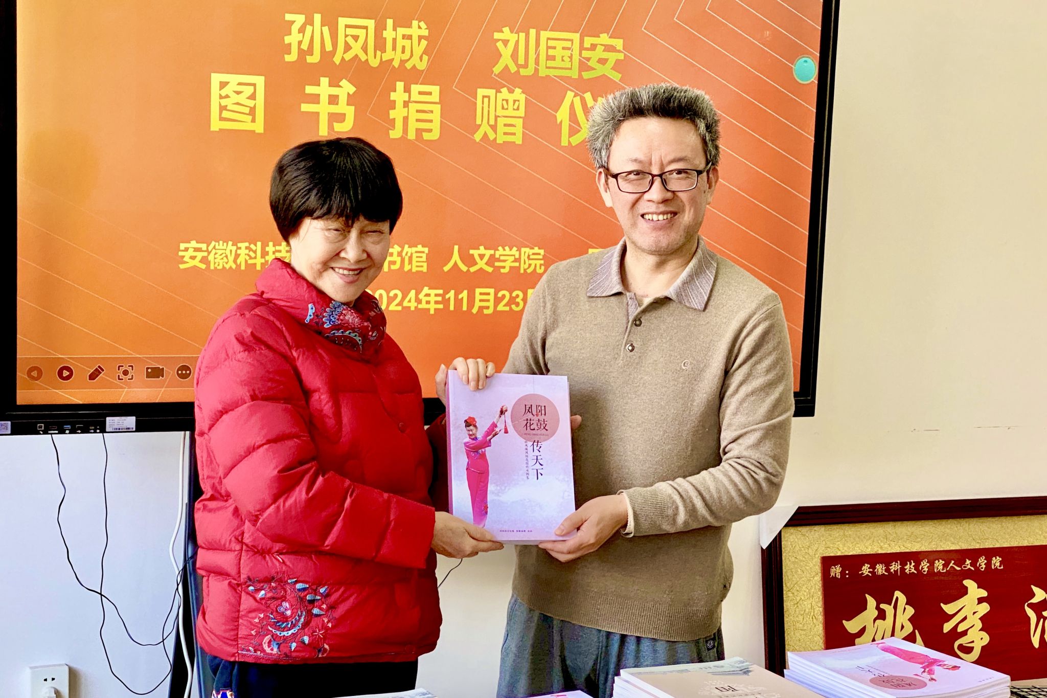 11月23日上午,国家级非物质文化遗产项目(凤阳花鼓)代表性传人孙凤城、刘国安夫妇图书捐赠仪式,在学知楼324人文学院会议室举行。开云在线登陆入口_开云(中国)客座教授——国家级非物质文化遗产项目(凤阳花鼓)代表性传承人孙凤城和凤阳电视台原副台长、安徽电视台特约记者、中国摄影家协会安徽分会会员刘国安,凤阳县文联主席陈友田,凤阳县教体局原副局长、凤阳年鉴主编张建人;人文学院院长、明文化研究会会长李晓东,图书馆馆长汪徐春、副馆长王玉林,人文学院中文系副主任、明文化研究会秘书长周广超参加相关活动。捐赠仪式由人文学院正处级组织员张严政主持。