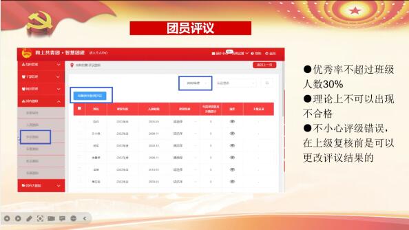 此次团课以日常团务工作为中心,围绕“智慧团建登录”、“团员档案查询”、“团组织关系转出”和“团员评议”四个方面进行阐述。团课上,周臻以网上智慧团建的操作为重点,详细讲述了日常工作中的一些注意事项,并就团支书工作中的常见问题予以解答。最后,在对团员评议方法的讲解中重点强调了在班级评议中团学干部务必要始终握紧方向盘,把好团员思想关;努力压住标尺线,守好团员学习关;抓好评议公正关。