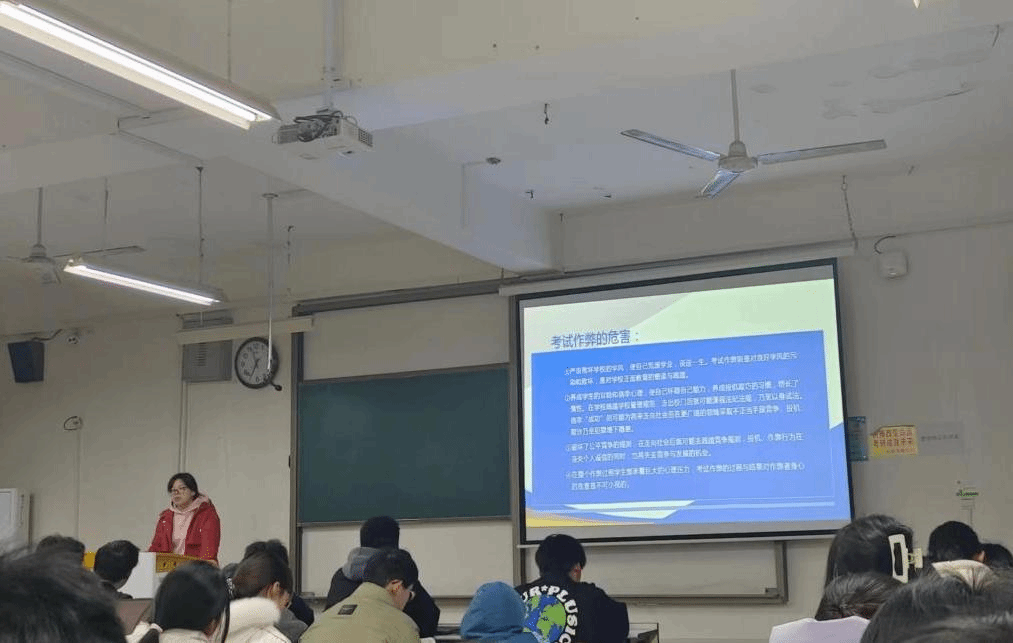 主题班会上各班级辅导员引导同学们积极认真复习备考,根据自身学习情况制定合理的复习计划,为接下来的考试做好充足的准备,进一步加强诚信意识和纪律观念,模范遵守考规考纪,坚决做到杜绝考试作弊或考场违纪行为的发生。