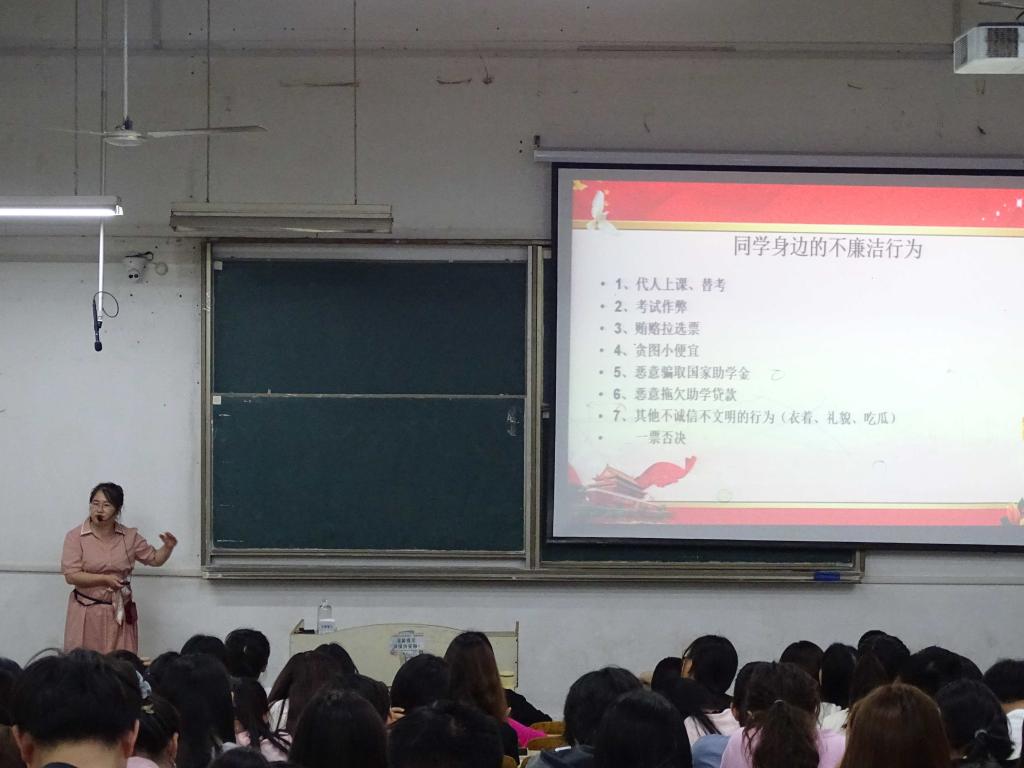 为深入开展学习贯彻习近平新时代中国特色社会主义思想主题教育,学习宣传贯彻党的二十大精神,进一步加强对入党积极分子、预备党员的廉洁教育培养,筑牢人文学子崇廉尚洁思想根基,引导学生树立廉洁观,提高廉洁自律意识,6月7日下午,人文学院于求知楼A103教室,开展“廉洁教育”主题党课讲座,讲座由学院党委副书记李沙娜主讲。学院入党积极分子、发展对象、预备党员等百余人参加。