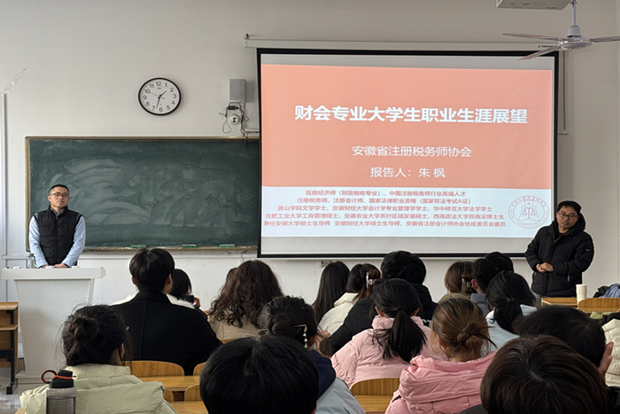 为加强职业生涯教育和就业指导,引导大学生树立职业生涯规划意识,形成正确的成才观、职业观、就业观,切实推动在校大学生高质量充分就业,12月24日,财经学院于龙湖校区致知楼B108举办财会专业大学生职业生涯展望专题讲座,邀请安徽省注册税务师协会负责人朱枫博士主讲。