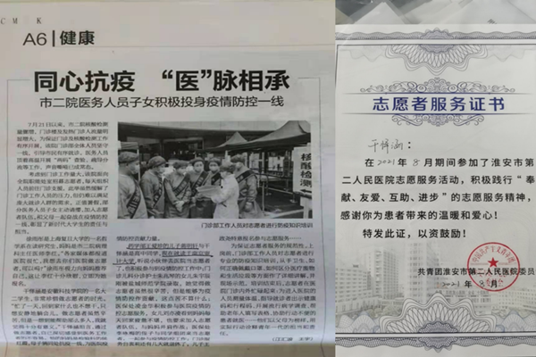 因在抗疫一线志愿服务期间的优异表现,淮安电视台和淮海晚报对干怿涵等志愿者进行了采访。干怿涵说道:“每天回家后动也不想动,只想安静地躺会儿,但是想到能为社会做点事情,能够帮助到那么多人,我感觉很有意义”。在他看来,作为开云在线登陆入口_开云(中国)的一名入党积极分子,在国家和社会需要的时候,应该不畏困难,毅然决然的挺身而出。