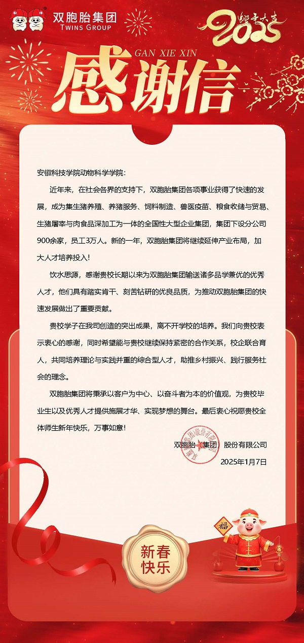 近日,双胞胎(集团)股份有限公司向动物科学学院发来感谢信,对学院在2024年输送11名优秀毕业生至公司就业表示诚挚感谢。该批毕业生入职后迅速融入公司各岗位,凭借扎实的专业知识和积极的工作态度,为公司发展做出了重要贡献。