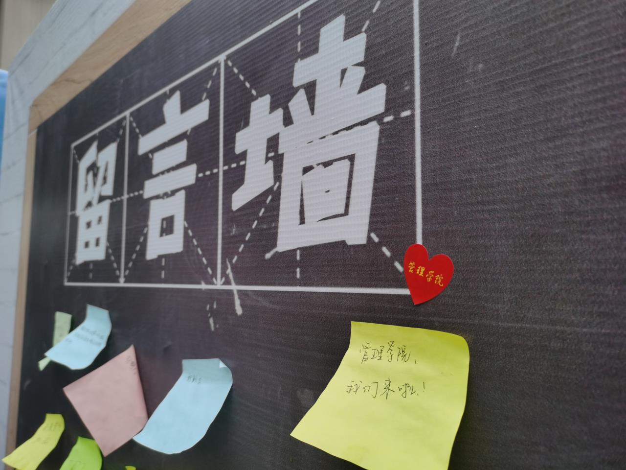 在合影背景墙的旁边,是特别制作的留言墙。合影后的新同学,拿起水笔,在便签上诉说着对未来崭新生活的憧憬。