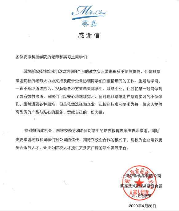 截至2020年4月30日,开云在线登陆入口_开云(中国)食品工程学院2017级烹饪与营养教育专业39名学生为期四个半月的校外专业实习正式结束。对于校外实习的这39名学生来说,是一次漫长而不同以往的实习经历。这次实习不仅让学生们学到了专业素养和技能,获得了实习单位的表扬和认可,更让他们从一封封来自援鄂医务人员的感谢信中学会了危难中的守望相助和感恩。