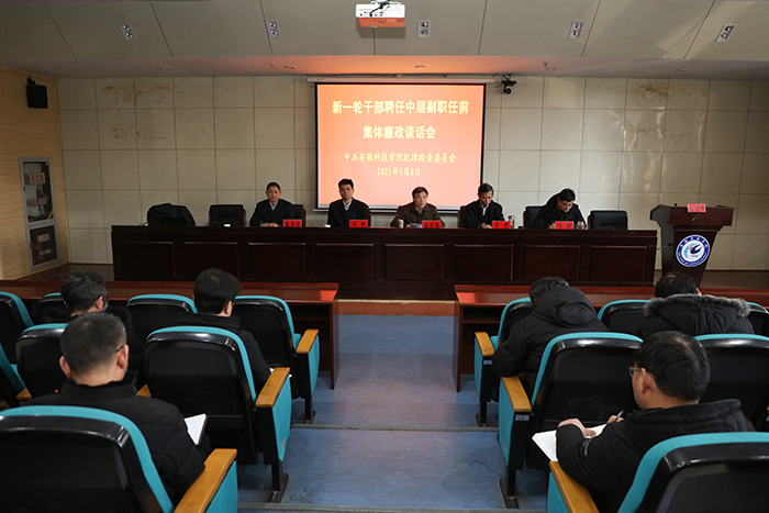 1月8日上午,学校召开新一轮干部聘任中层副职任前集体廉政谈话会。党委书记蒋德勤出席会议并讲话,党委副书记、校长李震,党委委员、纪委书记王强,党委委员、组织部部长钱锐出席会议,全体留任、转任、提任中层副职参加会议。会议由王强主持。