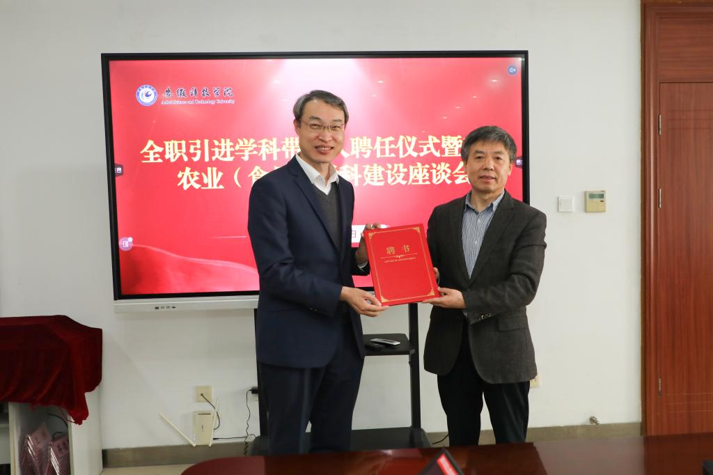 为整合优化农科资源,做优做强传统优势学科,开展新农科建设,更好对接支撑绿色食品等地方战略性新兴产业发展,在前期广泛深入洽谈基础上,近日,学校举行全职引进学科带头人尹雪斌博士的聘任仪式,并就功能农业(食品)学科建设进行座谈研讨。校党委书记蒋德勤,党委委员、副院长黄远友出席聘任仪式及座谈会,人事处、科研处、研究生处及动科、农学、生科、食品、资环等涉农学院负责人、尹雪斌团队其他成员参加了聘任仪式及座谈会。