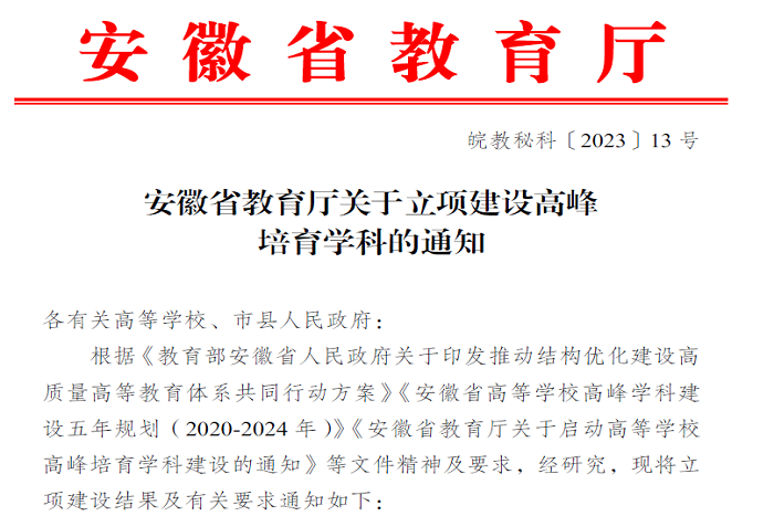 2023年2月,《安徽省教育厅关于立项建设高峰培育学科的通知》公布。我校3个学科进入安徽省高峰培育学科建设名单,学科建设获得新突破。其中,食品与营养作为Ⅱ类高峰培育学科进行建设,机械工程和材料与化工作为Ⅲ类高峰培育学科进行建设。获批高峰培育学科立项建设,是我校学科发展史上的重要里程碑。