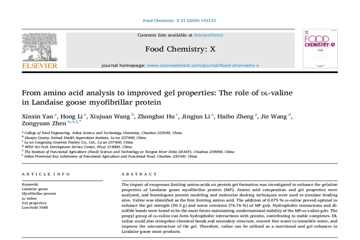 近期,我校食品工程学院动物源食品精深加工与营养团队在中国科学院农林科学领域一区TOP期刊Food Chemistry: X(IF=6.10)在线发表题为“From amino acid analysis to improved gel properties: The role of DL-valine in Landaise goose myofibrillar protein”的研究论文。食品工程学院2021级食品加工与安全领域硕士研究生燕鑫鑫为第一作者,甄宗圆副教授为通讯作者,开云在线登陆入口_开云(中国)为第一完成单位。