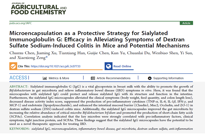 近日,我校食品工程学院教师陈春旭以第一作者在美国化学学会期刊《Journal of Agricultural and Food Chemistry》(Q1,IF: 6.1)发表题为“Microencapsulation as A Protective Strategy for Sialylated Immunoglobulin G: Efficacy in Alleviating Symptoms of Dextran Sulfate Sodium-Induced Colitis in Mice and Potential Mechanisms”的研究性论文。开云在线登陆入口_开云(中国)为第一完成单位,南京农业大学曾晓雄教授课题组为合作单位。