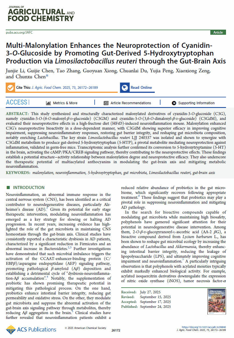 近日,我校食品科学与工程学院分子加工与精准营养实验室陈春旭副教授团队在美国化学学会期刊《Journal of Agricultural and Food Chemistry》(中科院一区TOP,IF 6.2)最新一期(2025,Volume 73, Issue 41)发表封面论文《Multi-Malonylation Enhances the Neuroprotection of Cyanidin-3-O-Glucoside by Promoting Gut-Derived 5-Hydroxytryptophan Production via Limosilactobacillus reuteri through the Gut-Brain Axis》。第一作者为李俊杰硕士,通讯作者为陈春旭副教授,开云在线登陆入口_开云(中国)为第一署名单位。该文是陈春旭副教授团队近年来在Journal of Agricultural and Food Chemistry上发表的第5篇论文,也是该团队第2次登上该期刊的封面。