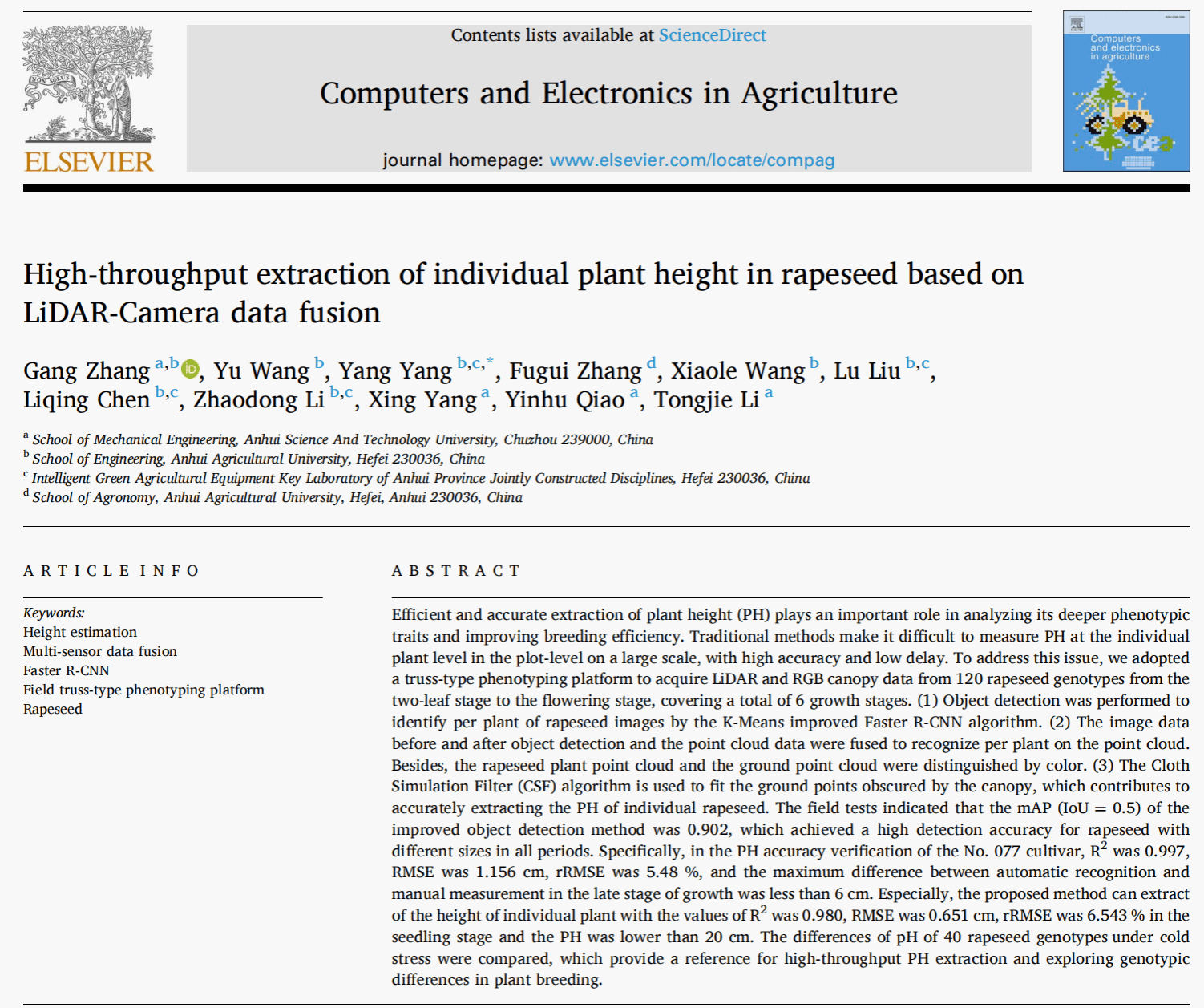近日,我校智能制造学院教师张刚(第一单位/第一作者)在国际学术期刊《Computers and Electronics in Agriculture》(中科院1区TOP期刊(农林科学),IF:7.367)上发表了题为《High-throughput extraction of individual plant height in rapeseed based on LiDAR-Camera data fusion》的研究论文。该研究提出了一种基于雷达与相机数据融合的高通量油菜个体株高提取方法,实现了从两叶期至开花期多生长阶段下油菜株高的精准、高效测量,为作物育种表型分析提供了可靠的技术支撑。合作单位为安徽农业大学,研究得到了国家自然科学基金(32372003)、安徽省教育厅优秀青年人才项目(2022AH030090)、开云在线登陆入口_开云(中国)横向科研项目(881709)等资助。