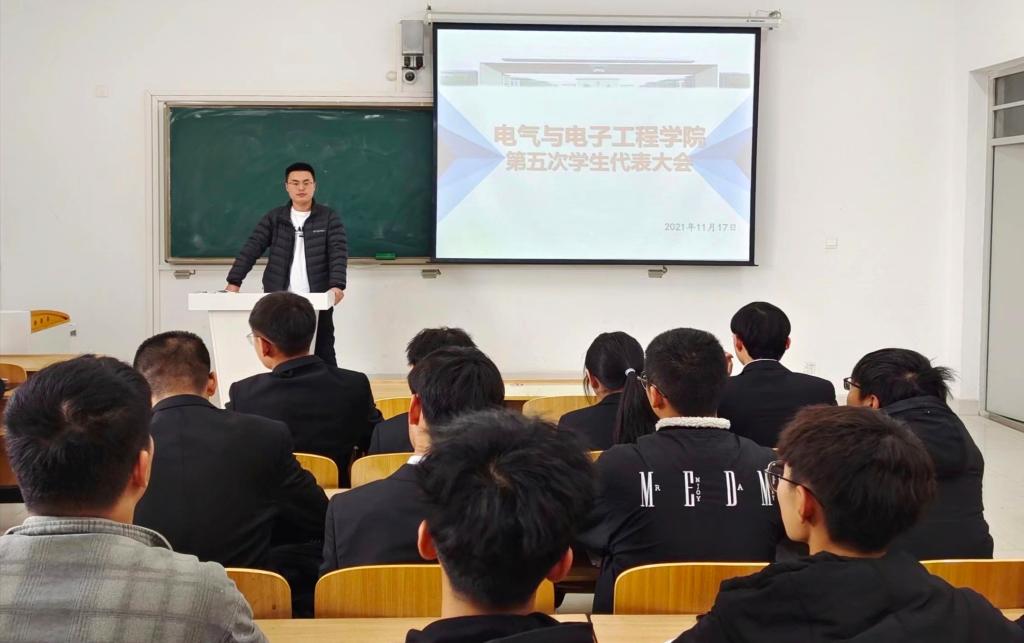 11月17日中午,电气与电子工程学院于致知楼A105召开第五届学生代表大会,电气与电子工程学院团委副书记、学生会指导教师于宏亮,院学生会主席、第四届学生委员会代表毕玉龙及全体学生代表参加本次会议。会议由院学生会综合事务部部长孙欣然主持。