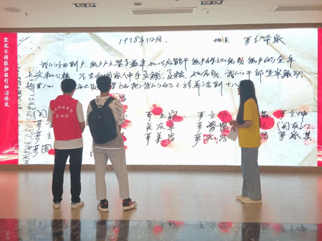 大包干纪念馆新展馆总建筑面积达5500平方米,馆内分为“溯源、抉择、贡献、巨变、展望、关爱”六个部分。进入大厅,映入眼帘的便是记载珍贵影像的屏幕,生动真实地再现了当年“大包干”从酝酿到发生到发展的全过程。随后,团队成员们看见在木碑上撰有小岗村的“三农”工作,成员们积极讨论指出:“统分结合这种经营方式是中国农民的杰出创造,它有广泛的适应性和强大生命力”,坚持解决好三农问题是全党工作重中之重。最后,团队成员们为参观人员对馆内文物、历史事件进行解读:18位“大包干”领导人以“托孤”的勇气立下生死状,悄然“分田到户”,创造了大丰收的佳话。
