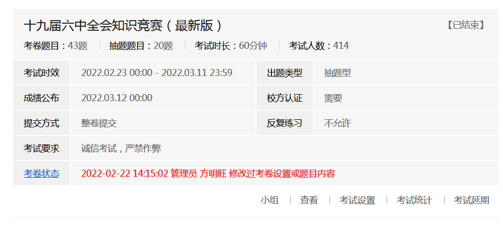 为进一步学习党的十九届六中全会精神,全面提升学生的政治素养和理论水平,进一步增强基层党组织的凝聚力和战斗力。人文学院于2022年2月23日至3月11日,举办了以“学习贯彻党的十九届六中全会精神”为主题的知识竞赛。此次知识竞赛依托于易班优课课群,来自9个学院共计414名同学参加了此次活动。
