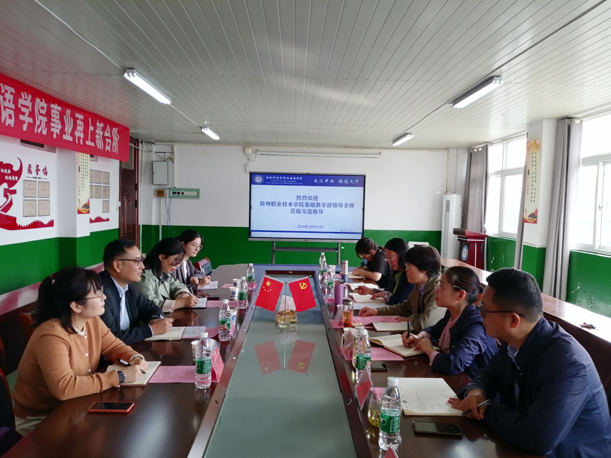 10月10日上午,滁州职业技术学院基础教学部副主任(主持工作)刘杰一行4人前来外国语学院就“大学外语课程教学与教科研建设”开展交流活动。外国语学院党政领导和教师代表参加座谈会。座谈会由外国语学院党委书记蔡为青主持。