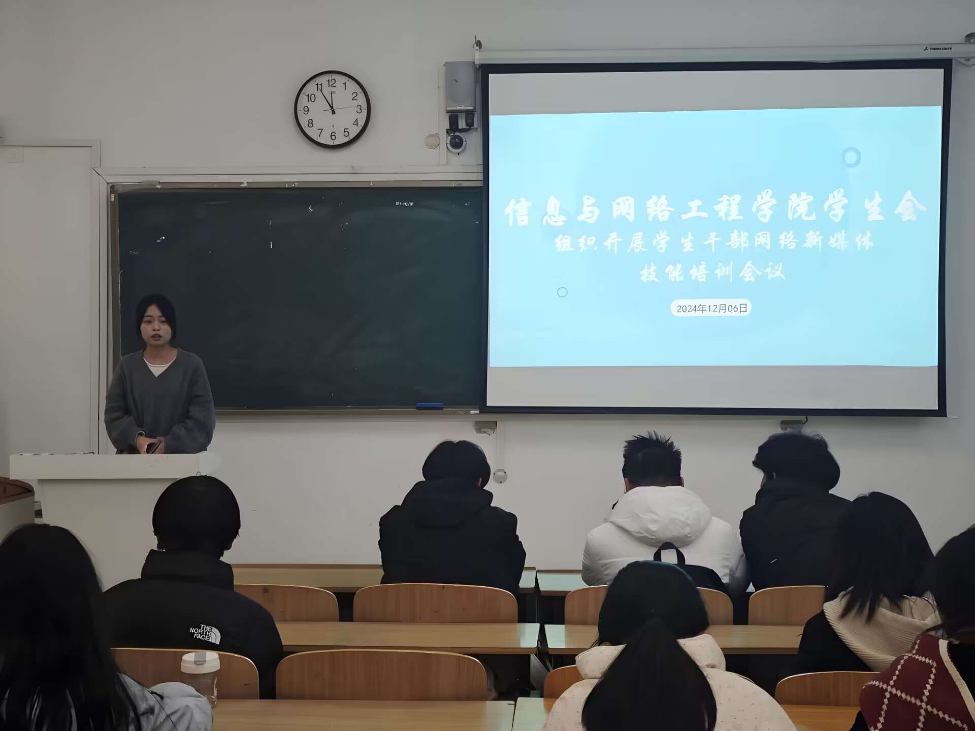 为强化学生干部网络安全意识,增强新媒体技术运用水平。12月6日,信息与网络工程学院学生会在致知楼C109组织开展“学生干部网络新媒体技能培训”会议。学院学生会宣传部全体成员及2024级宣传委员参加本次会议,培训由学生会宣传部负责人谢欣主讲。
