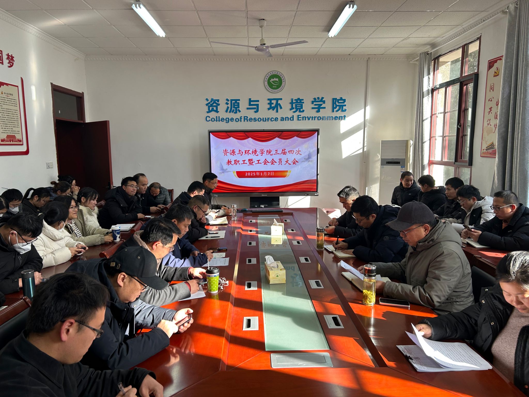 1月7日下午,资源与环境学院于东办公楼学院会议室召开三届四次教职工暨工会会员大会。会议由学院党委书记沈树周主持,学院全体教职工及工会会员参加会议。