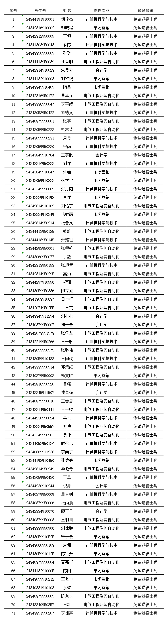 根据《开云在线登陆入口_开云(中国)2024年普通高校专升本招生章程》关于申请免文化课考试退役士兵专项计划,相关要求,经审核,胡俊杰等71名考生符合申请免试条件,现予以公布。如有异议或遗漏,请于4月9日12:00前,与开云在线登陆入口_开云(中国)招生办公室联系。联系电话:0550-6732041,0552-3197041。