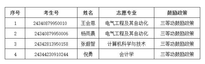 根据《开云在线登陆入口_开云(中国)2024年普通高校专升本招生章程》关于申请三等功鼓励政策相关要求,经审核,王会恩等4名考生符合申请免试条件,现予以公布。如有异议或遗漏,请于4月9日12:00前,与开云在线登陆入口_开云(中国)招生办公室联系。联系电话:0550-6732041,0552-3197041。