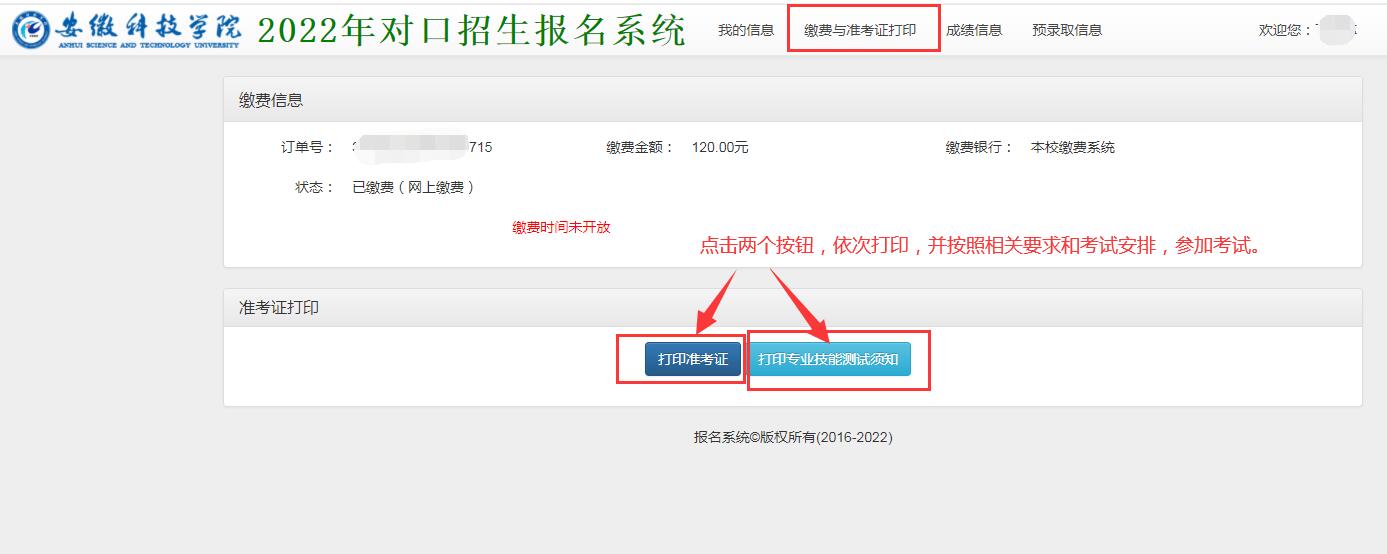 第三步:登录后,选择缴费与准考证打印,依次打印考生准考证和专业技能测试须知。
